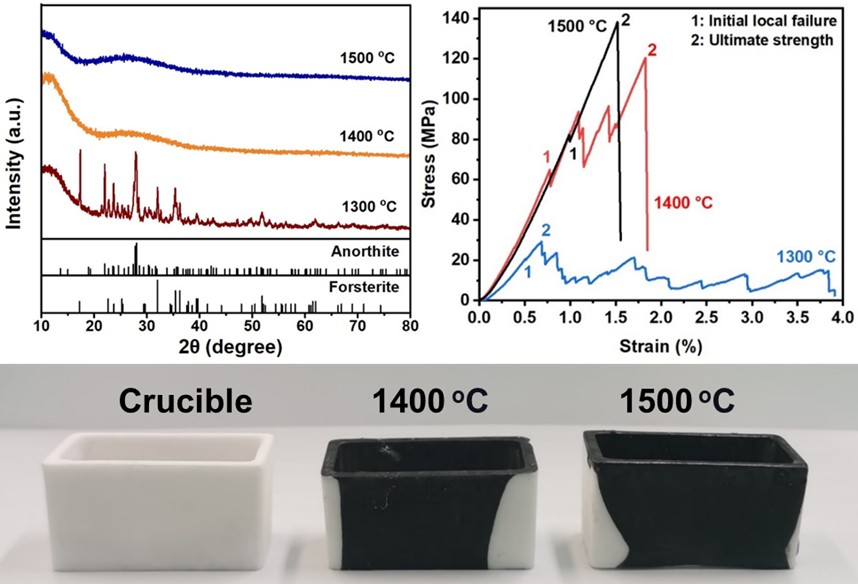 Recently, the Prof. Peng-Cheng Ma’s group at the Xinjiang Technical Institute of Physics and Chemistry (XTIPC) of the Chinese Academy of Sciences (CAS) conducted research on this issue. The study used the CLRS-1 low-titanium basaltic simulated lunar soil national standard sample as the research object, melting it in a vacuum environment at different temperatures (1100 °C, 1200 °C, 1300 °C, 1400 °C, 1500 °C) and solidified it (Figure 1), and studied the morphology, structure, and mechanical properties of the melted process and the solidified sample (Figure 2).