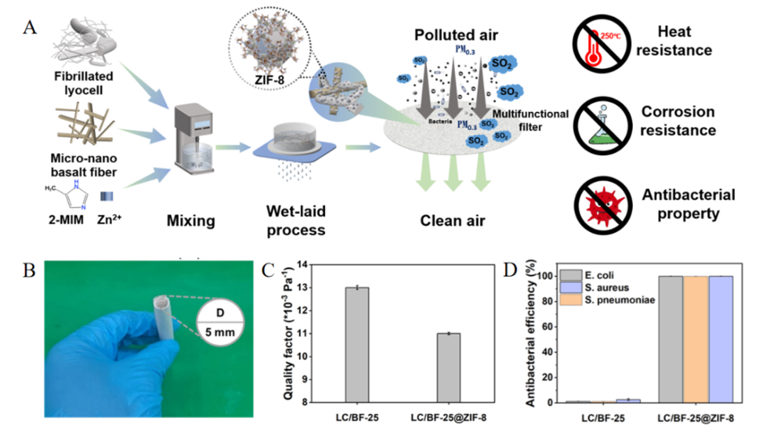Recently, the Energy and Chemical Engineering Research Center in the Xinjiang Technical Institute of Physics and Chemistry, Chinese Academy of Sciences, has made progress in development of environmentally friendly and multifunctional air filtration materials. The research team used Lyocell fibers and basalt fibers as raw materials, and prepared several composite fiber filtration materials via a wet-laid process (Fig. 1A). These materials exhibit excellent flexibility. Compared with pure cellulose fiber-based filtration materials, the burst strength and tear strength of the composite materials (incorporated with basalt fibers) have been significantly improved. Furthermore, zeolitic imidazolate framework-8 (ZIF-8) was in-situ grown on the surface of the filtration materials, endowing them with outstanding air purification and antibacterial properties. The resulting material achieved a filtration efficiency of 97.72% for PM₀.₃. Surface functionalization with ZIF-8 notably enhanced the harmful gas adsorption capacity of the filtration materials: the SO₂ adsorption capacity increased by 93%, and the toluene adsorption capacity increased by 111.5%, demonstrating the ability to synergistically capture particulate matter and harmful gases. Basalt fibers imparted excellent heat resistance to the filtration materials, enabling them to maintain stable filtration performance even at 250 °C. In addition, the loaded ZIF-8 can release Zn²⁺ ions, giving the filtration materials broad-spectrum antibacterial activity. The antibacterial efficiency against E. coli, S. aureus, and S. pneumoniae exceeded 99.8%, and good antifungal effects were also observed. Besides, the composite filtration materials are fabricated using natural biomass and mineral fibers (Lyocell and basalt fibers) via an adhesive-free process, resulting in a good degradability for the filter media. After 21 days of soil burial, the mass loss rate of the materials reached 32.2%. Overall, this research provides an efficient, multifunctional, and sustainable solution for air filtration in complex environments.