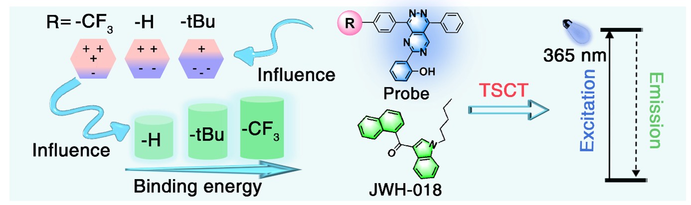 The substituent design and photophysical property manipulation are of paramount importance in fluorescent probe design, particularly crucial for chemically inactive molecules that lack reactive functional groups, such as synthetic cannabinoids. To address these challenges, the team from the Xinjiang Key Laboratory of Trace Chemical Substances Sensing at the Xinjiang Technical Institute of Physics and Chemistry has successfully developed an organic fluorescent probe design strategy based on the through-space charge transfer (TSCT). Specifically, leveraging a pyrimido[4,5-d]pyridazine group as the fluorophore, three 5-phenylpyrimido[4,5-d]pyridazin-2-yl)phenol derivative probes were rationally designed with tailored donor-acceptor substituents of R group at the para-position of the benzene ring. By precisely modulating non-covalent interactions and TSCT between the probe and JWH-018, our team significantly enhanced both their binding energy and the optical signal contrast after detection, resulting in a distinct ratiometric fluorescent response (blue-to-green emission shift). The optimized probe, 2-(5-phenyl-8-(4-(trifluoromethyl)phenyl)pyrimido[4,5-d]pyridazin-2-yl)phenol (DPTF), achieved an ultra-low detection limit of 2.16 nmol/mL for JWH-018 with a naked-eye detection limit of 101 nmol/mL, and exhibited excellent selectivity and anti-interference against 18 potential interfering illicit drugs. To facilitate real-world applications, the researchers constructed a sponge-based DPTF-probe-embedded sensing chip and integrated it into a portable self-developed Drugs Analyst, enabling the on-site rapid detection of JWH-018 in complex matrices, such as E-liquid, urine, artificial saliva and local sewage. Overall, this study advances the development of sensing materials based on noncovalent interactions, and deepens our understanding of intermolecular TSCT photophysical mechanisms, while providing available approaches for drug inspection and criminal scene investigation.