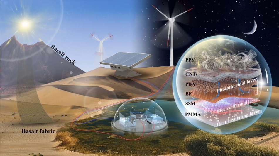 To overcome these limitations, Prof. Abudukeremu Kadier and Prof. Peng-Cheng Ma’s group at the Xinjiang Technical Institute of Physics and Chemistry (XTIPC) of the Chinese Academy of Sciences (CAS) has successfully developed an innovative basalt fabric-based photothermal interfacial PPY-CNTs-PDA@BF evaporator with SSM 304 electrothermal layer for all-weather efficient brackish water desalination. During the evaporation tests, a xenon lamp was employed to simulate solar radiation, while electrical input was provided by energy converted from solar panels and stored in a battery under low-light or no-light conditions. The evaporator was placed on an electronic balance to monitor changes in mass over time. Under simulated sunlight (1 sun) and 1.5 V in the laboratory, the evaporation rate of actual brackish water can reach 4.43 kg m−2 h−1; under real sunlight and 1.5 V outdoors, the evaporation rate can reach up to 6.37 kg m−2 h−1. Additionally, due to the well-designed multilayer structure with Janus hydrophilicity gradient distribution, the evaporator exhibits excellent salt resistance and long-term stability, maintaining a daytime evaporation rate above 2.17 kg m−2 h−1 during 120-hour continuous operation without any intervention. Purified water meets the drinking water standards set by the WHO, with significant reductions in ion concentrations and chemical oxygen demand. This study provides a promising approach for efficient and sustainable brackish water purification, offering potential applications in water-scarce regions.