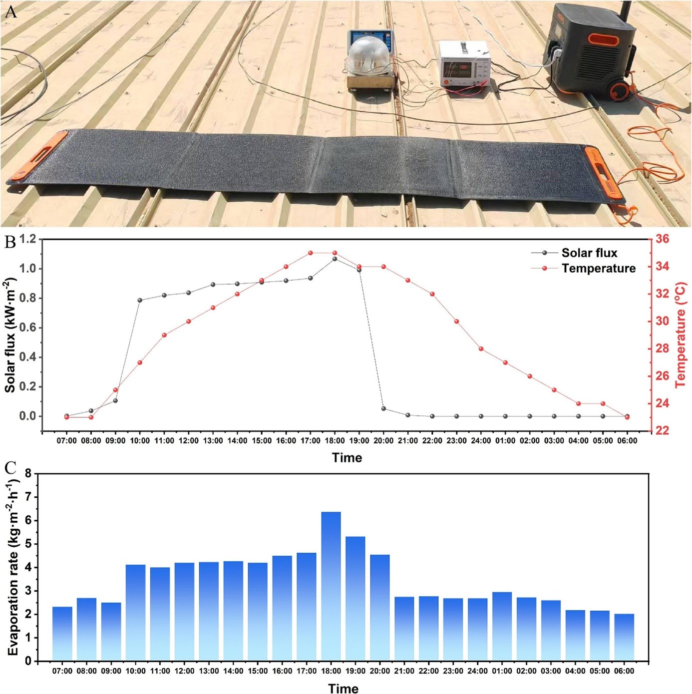 Figure 2. Outdoor evaporation performance of PPY-CNTs-PDA@BF (A: Schematic diagram of the outdoor solar interface evaporation device; B: Solar irradiance and ambient temperature during the daytime; C: Evaporation rates of PPY-CNTs-PDA@BF at different times of the day).