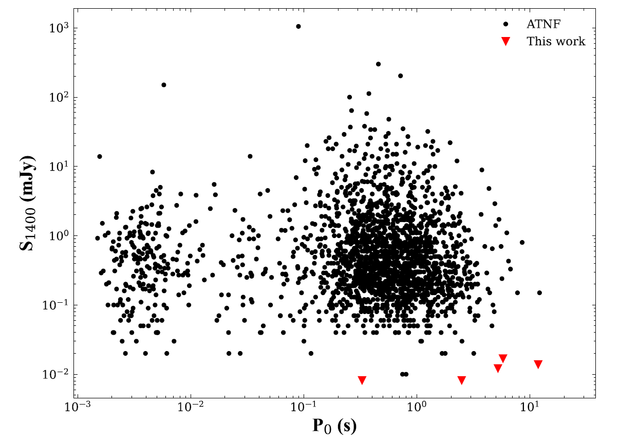 Despite the deep observations, no periodic radio pulsations or single pulses were detected. The derived strict upper limits on flux density at 1250 MHz (S1250 < 16.9 Jy) are significantly lower than the flux densities of known radio pulsars (see Figure 1). This suggests that these objects may be intrinsically radio-quiet or their radio beams are not favorably aligned with Earth. Notably, PSR J1846–0258 was observed one month after its 2020 X-ray outburst, providing a crucial constraint on the timing of potential transient radio emissions.
